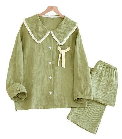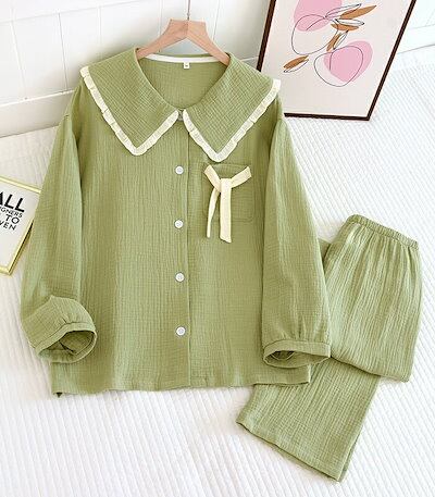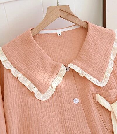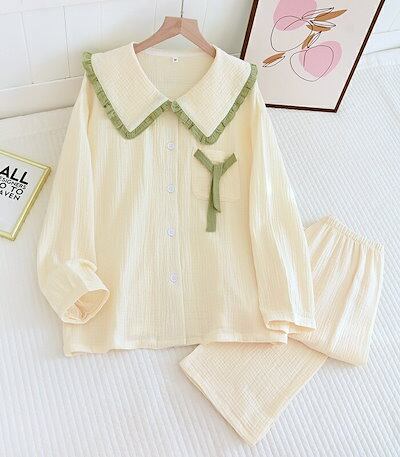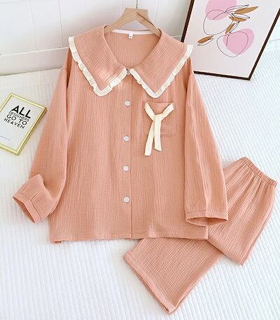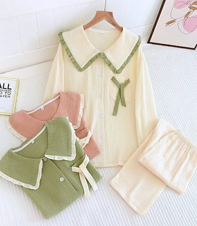 ガーゼパジャマ レディース ルームウェア パンツ 春 秋 ガーゼコットン vネック フリル 配色 春秋 長袖 ダブルガーゼ 2重ガーゼ 綿 部屋着 セットアップ 2点セット ナイト 寝間着 寝巻き 上