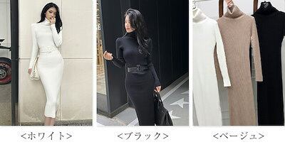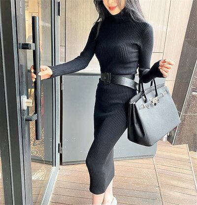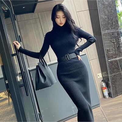 ニットワンピ タイト レディース ひざ下 ストレッチ タイトニット 長袖 ハイネック タートルネック セクシー 秋 春 冬 ベルト付き 秋 冬 デート服 ワンピース オフィス お洒落 小顔 美脚効果