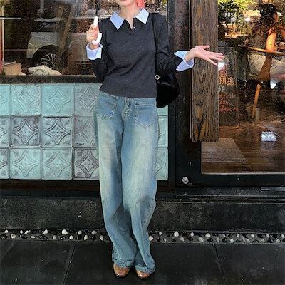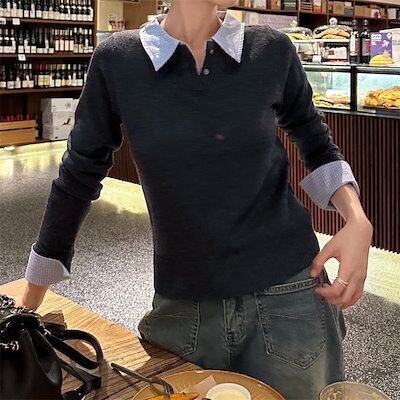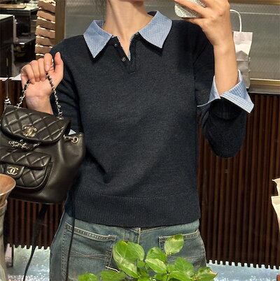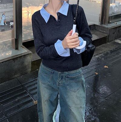 カットソー ニット レディース 長袖 トップス ドッキング 異素材 切り替え ブラウスネック ライトニット 春ニット リブ ニットウェア ニットソー セーター プルオーバー トップス ニットプルオーバ