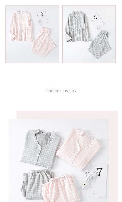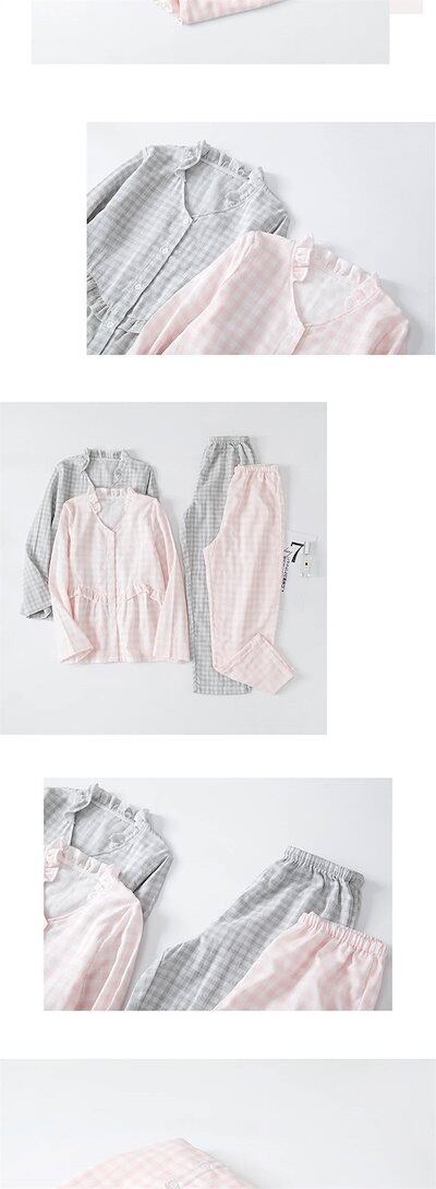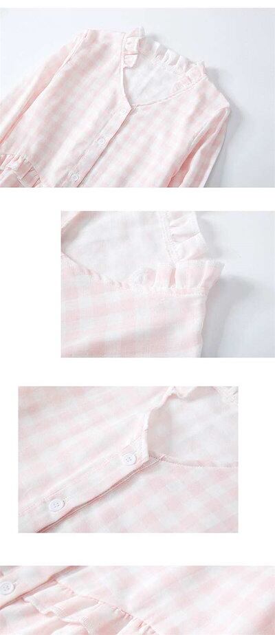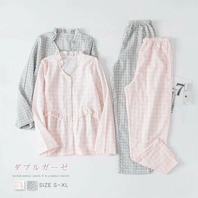 ガーゼ パジャマ レディース ルームウェア パンツ 春 秋 ガーゼコットン キーネック フリル チェック 春秋 長袖 ダブルガーゼ 2重ガーゼ 綿 部屋着 セットアップ 2点セット ナイト 寝間着 寝