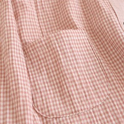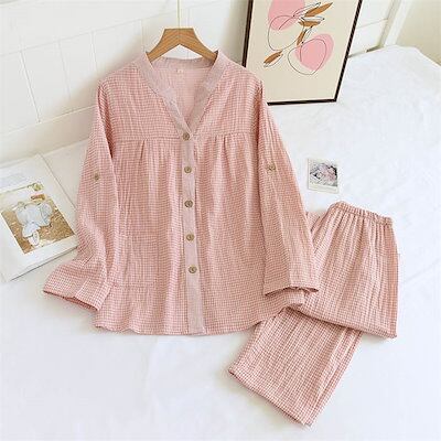 ダブルガーゼ パジャマ レディース ルームウェア パンツ 春 秋 ガーゼコットン キーネック チェック 春秋 長袖 ガーゼ 2重ガーゼ 綿 部屋着 セットアップ 2点セット ナイト 寝間着 寝巻き 上