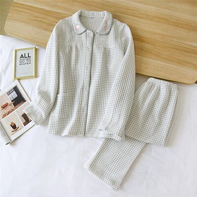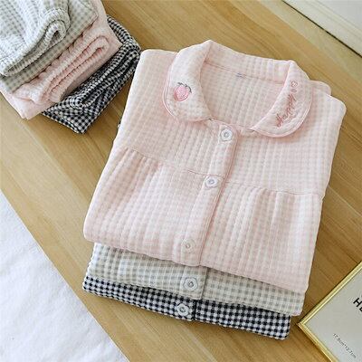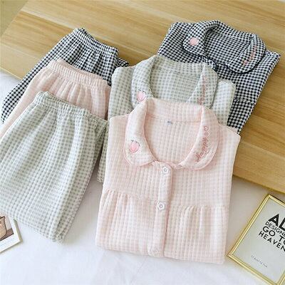 厚手 綿 チェック柄 ルームウェア 冬 パジャマ レディース 可愛い 長袖 部屋着 セットアップ 2点セット 寝間着 春 秋 寝巻き 上下セット 前開き ナイトウェア 快適 大きいサイズ コットン 丸