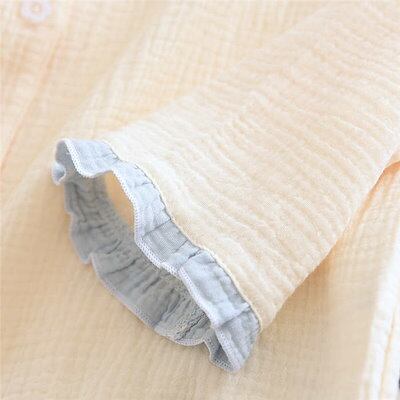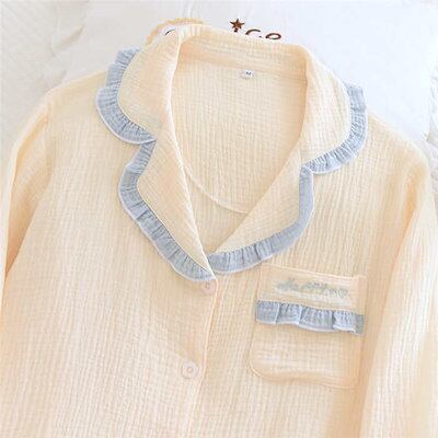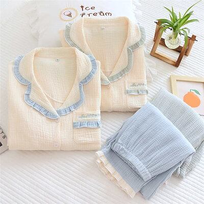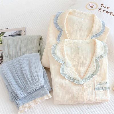 上下配色 ガーゼ パジャマ レディース ルームウェア 長袖 部屋着 セットアップ 2点セット ガーゼ フリル コットン 大人 寝巻き ナイトウェア ゆったり 上下セット 春 秋 冬 ウエストゴム 上品