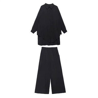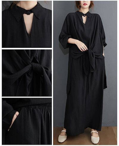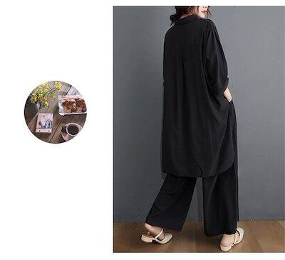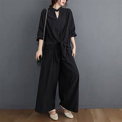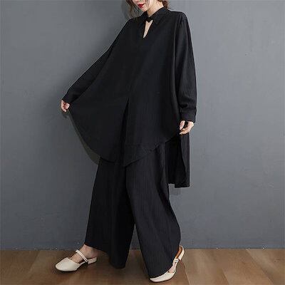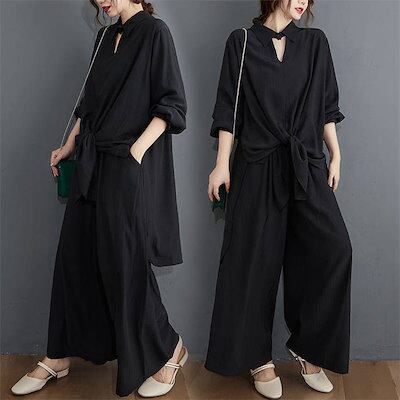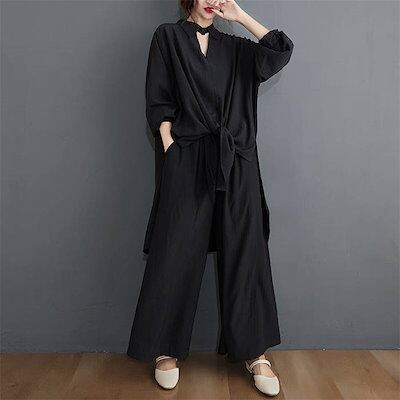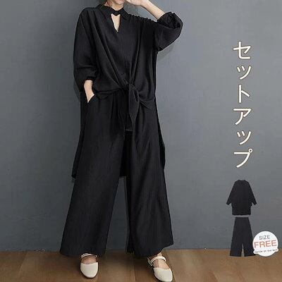 セットアップ レディース カジュアル ブラウス ワイドパンツ 2点セット ロングパンッ 無地 ガウチョパンツ 上下アップ 冷房対策 オフィス 長袖 スリット ウエストゴム ボトムス トップス おしゃれ