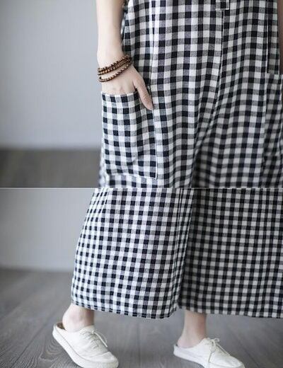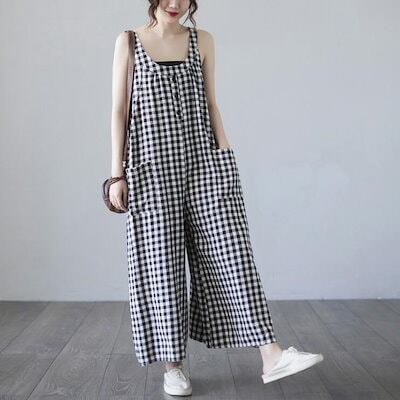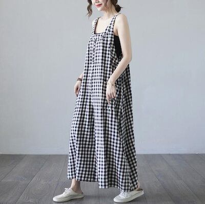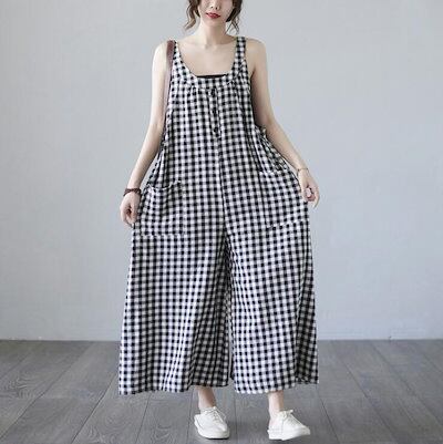 オールインワン サロペット チェック オーバーオール ガウチョ パンツ リネン ワイドパンツ ワンピース レディース 9分丈 ロング丈 ノースリーブ オーバサイズ 大きめ 春 夏