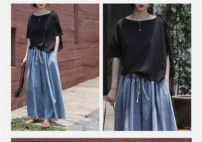 ワイドパンツ レディース デニム ガウチョパンツ デニムワイドパンツ 夏 秋 春 大きいサイズ ゆったり ボトムス 春夏 デニムパンツ フレアパンツ イージーパンツ 体型カバー ウエストゴム 無地 リ