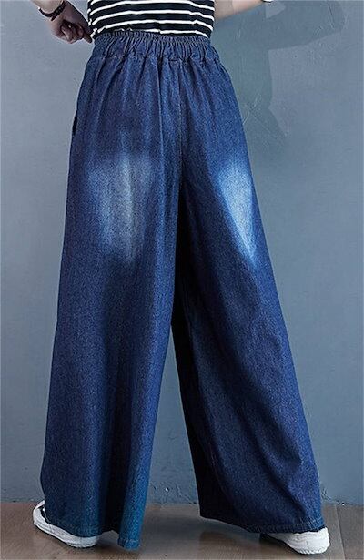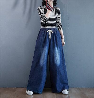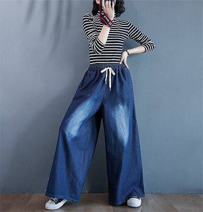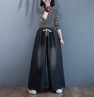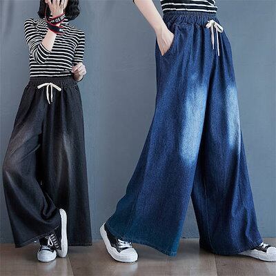 パンツ レディース ロング ボトムス 春秋 春 夏 秋 デニムパンツ ワイドパンツ ワイド リラックス イージー フレアパンツ ゴムウエスト 無地 着回し コットン デニム 体型カバー 綿 お洒落 細