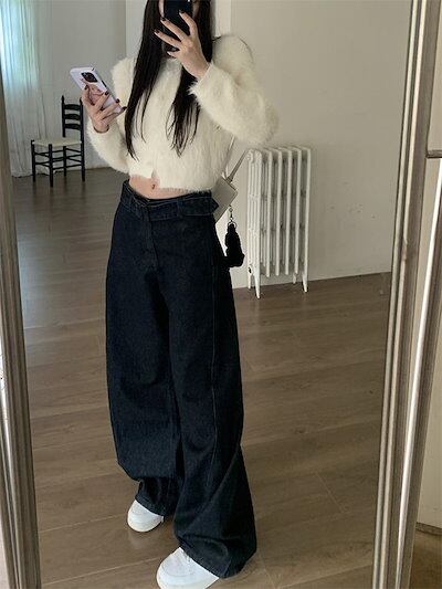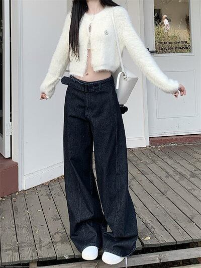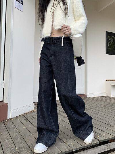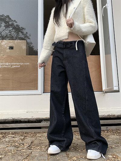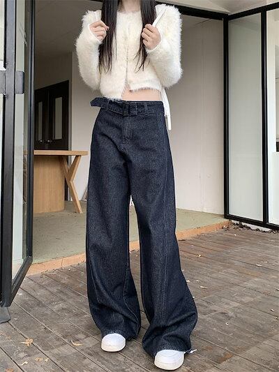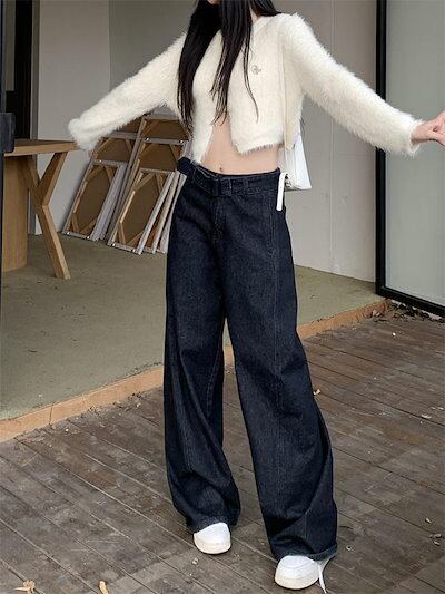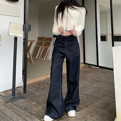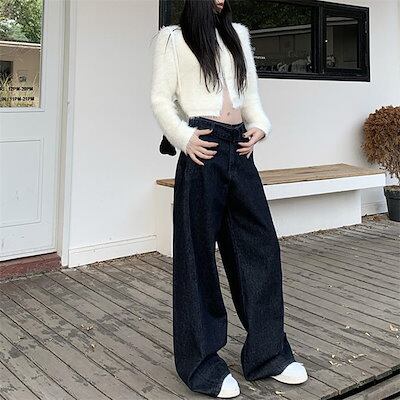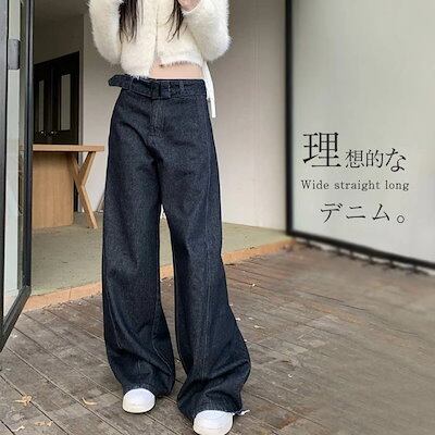 デニム パンツ ワイドパンツ レディース ロング丈 マキシ丈 ストレートパンツ ズボン 春 秋 デニムパンツ ハイウエスト ボトムス デニムワイドパンツ ウエストリボンベルト 無地 上品 きれいめ 体