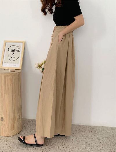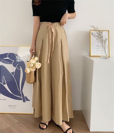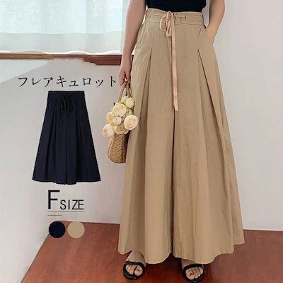 パンツ ワイドパンツ レディース フレアキュロット タックプリーツ ロング丈 ボトムス ウエストリボン バックゴム ゆったり 春