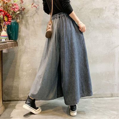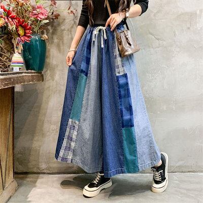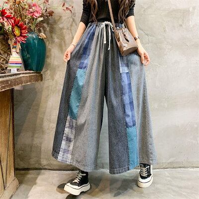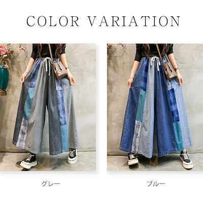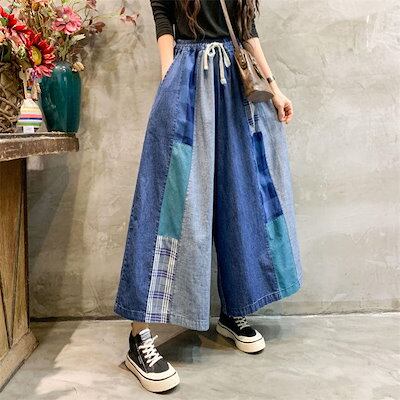 デニム ワイドパンツ レディース デニム ウエストゴム 秋 春 デニムパンツ レディース ワイド フレア デニム パンツ 大きいサイズ ゆったり ボトムス フレアパンツ 体型カバー 切り替え 着痩せ