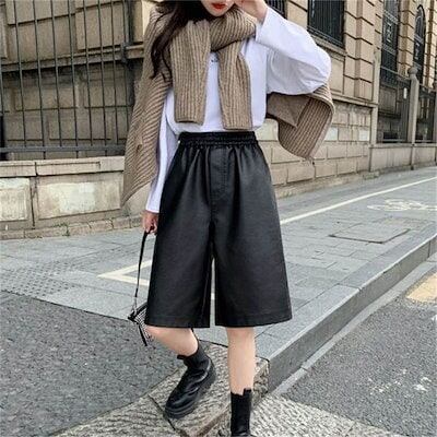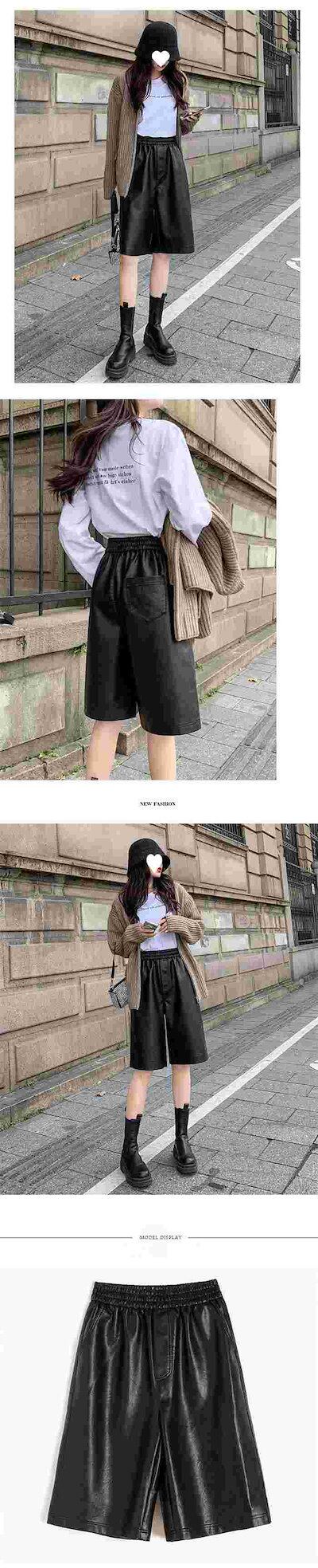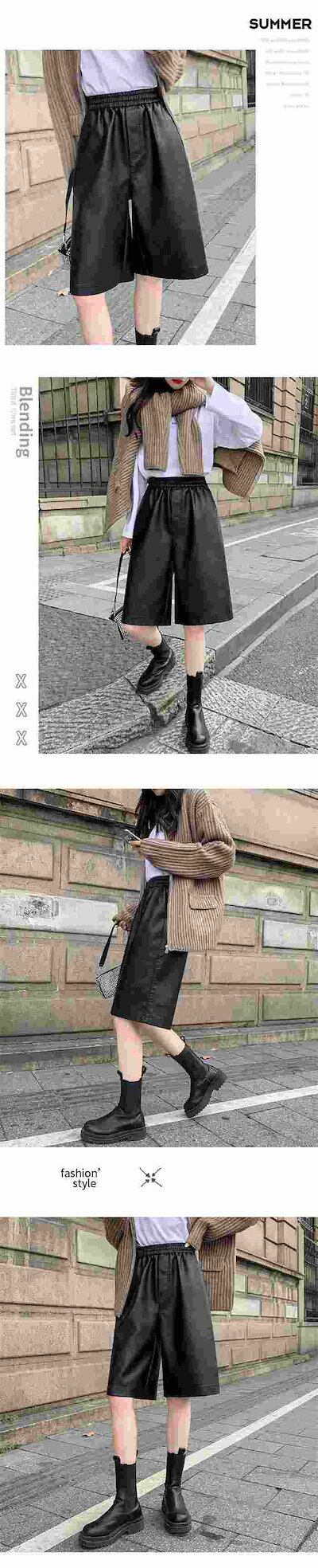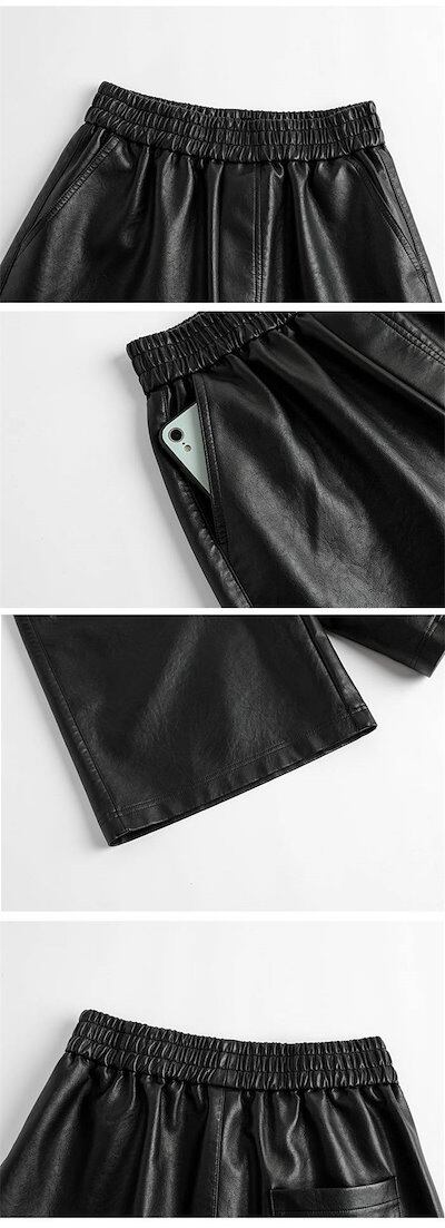 PUレザー ワイドパンツ レディース パンツ 春 秋 冬 無地 おしゃれ 5分丈 5分丈パンツ 合成皮革 ウエストゴム ボトムス ハイウエスト カジュアル 美脚パンツ 着やせ 秋冬 スラックス 大人パ