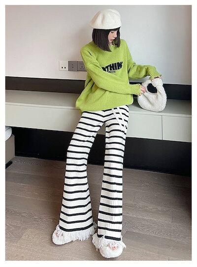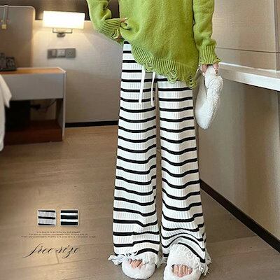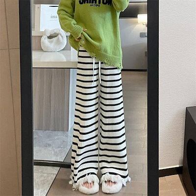 ワイドパンツ レディース ガウチョパンツ ニット ニットパンツ ボーダー ボトムス 配色 ワイドパンツ 春秋 春 夏 秋 レディースパンツ スラックス 大人パンツ キレイめ エレガント 大人 お洒落