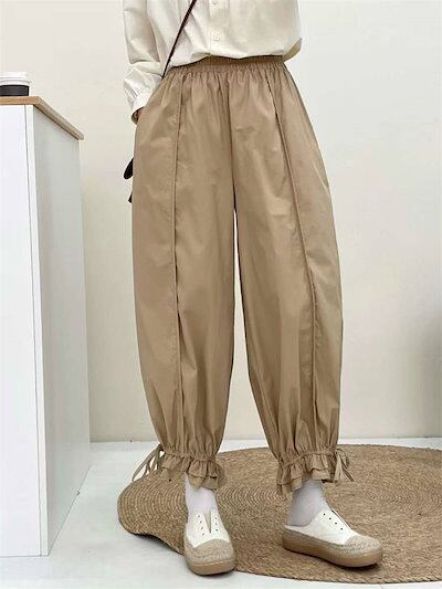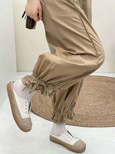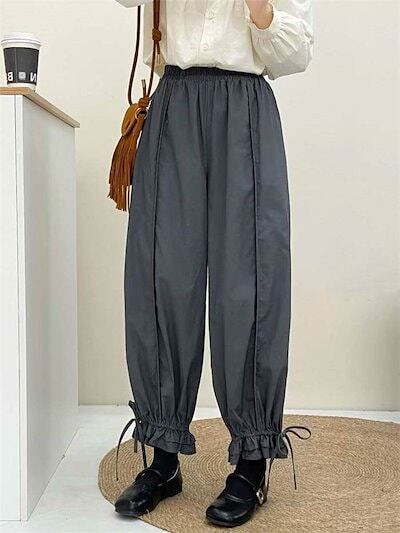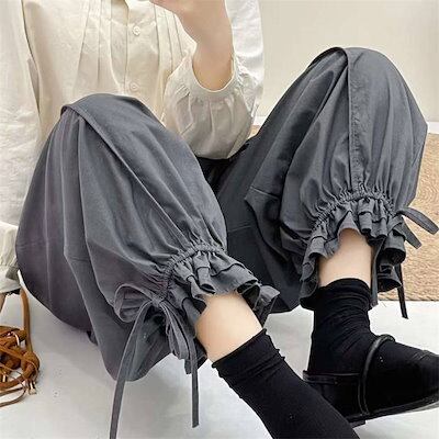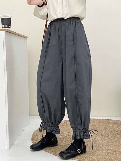 ワイドパンツ レディース コットン リポン ボトムス フリル ギャザー 9分丈 ワイドパンツ 春秋 春 秋 レディースパンツ スラックス ロング丈パンツ キレイめ エレガント 大人 お洒落 ワイド き