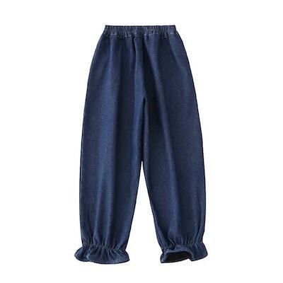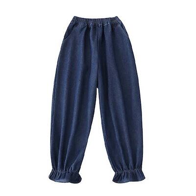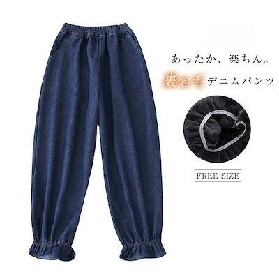 裏起毛 デニムパンツ 裾 フリル ロング パンツ デニム イージーパンツ レディース ワイド ルーズ ストレート テーパード 冬 秋 春 あったか 暖かい 重ね着 ゆったり ボトムス ポケット 体型