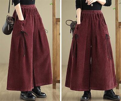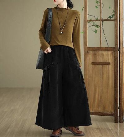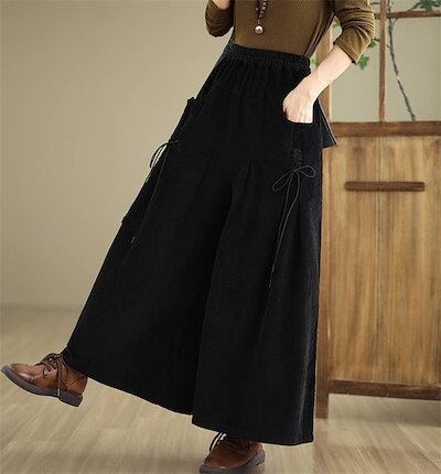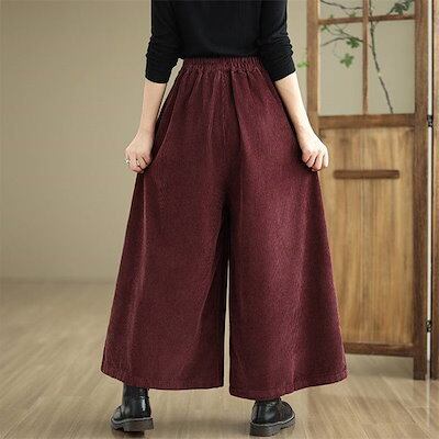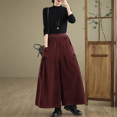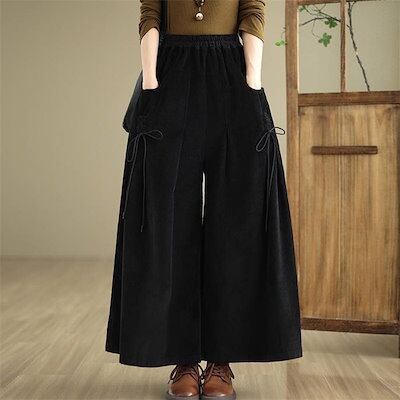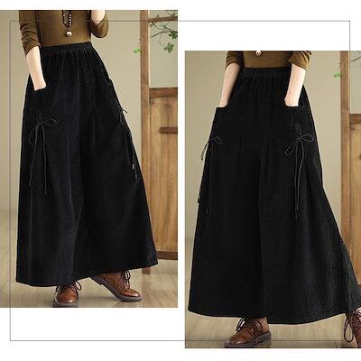 コーデュロイ パンツ レディース 秋冬 ワイドパンツ フレアパンツ 秋 春 ボトムス 体型カバー ロングパンツ タック リボン 着痩せ 美脚 通勤 大人 シンプル カジュアル ゆったり 黒 ブラック