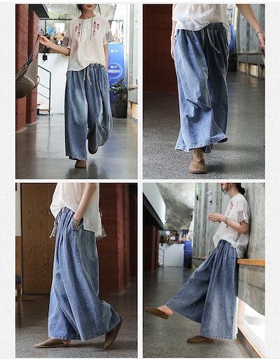 デニムワイドパンツ レディース 大きいサイズ ワイドパンツ ウエストゴム デニムパンツ ウチョパンツ フレアパンツ ボトムス カジュアル 無地 ロングパンツ 大人 楽ちん ゆったり カジュアル お腹