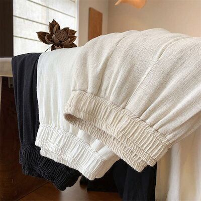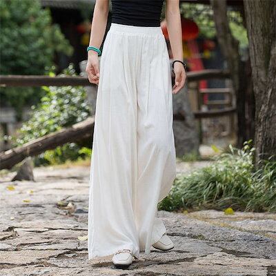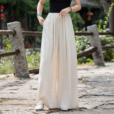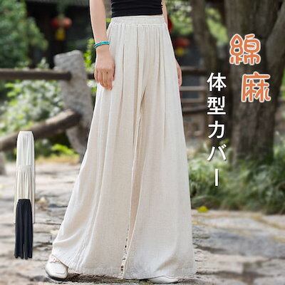 ワイドパンツ リネン レディース ボトムス パンツ ロングパンツ ルームウェア 部屋着 ワイド ロング丈 ロング ハイウエスト ウエストゴム ポケット付き 麻 綿麻 コットン 麻混 無地 体型カバー