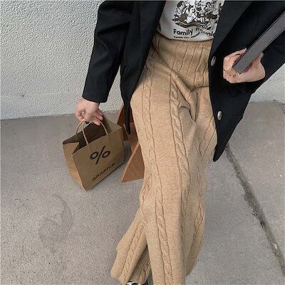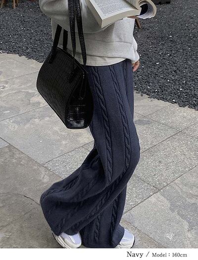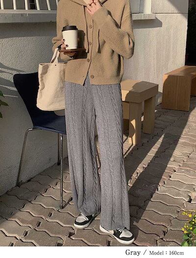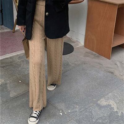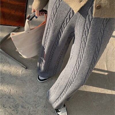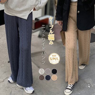 ニットパンツ レディース 秋冬 ワイドパンツ ロングパンツ ニット ケーブル編み イージーパンツ ボトムス ロング丈 ズボン ケーブルニット 厚手 ケーブル ウエストゴム 楽ちん 無地 シンプル モ