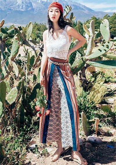 ガウチョパンツ ボヘミアン シフォン ワイドパンツ レディース エスニック ロングパンツ パンツ ガウチョ 雰囲気 脚長 ストライプ ビーチ バカンス リゾート ボトムス お出かけ ビーチ 海 海水浴