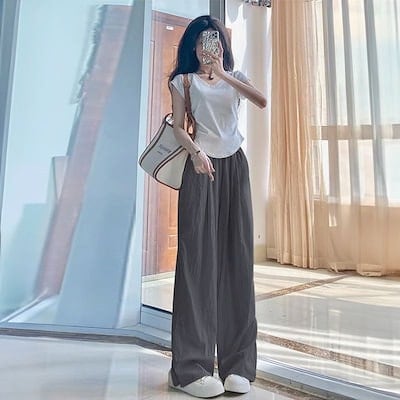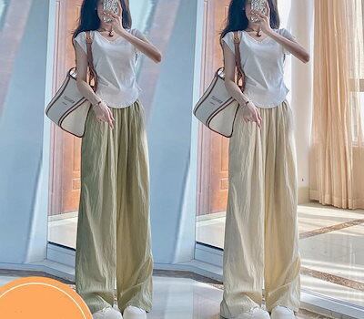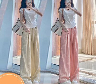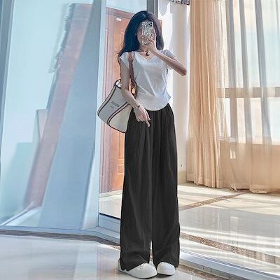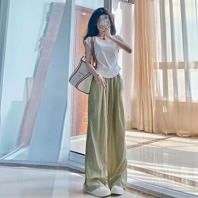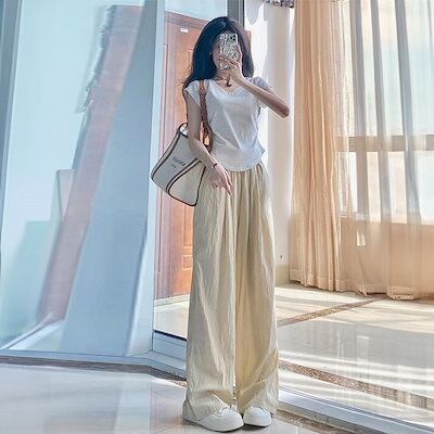 韓国ファッション 新作 接触冷感ボトムス 体型カバー ワイドパンツ ハイウエスト アイスシルク ズボン レディース 着痩せ スラックスパンツ