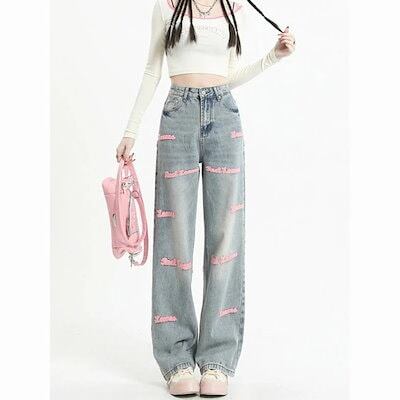 3日以内出荷脚長効果デニムパンツ ヴィンテージ ワイドパンツ ハイウエスト レディース 刺繍 ストレートレッグ・パンツ ルーズ ワイドパンツ 韓国ファッション