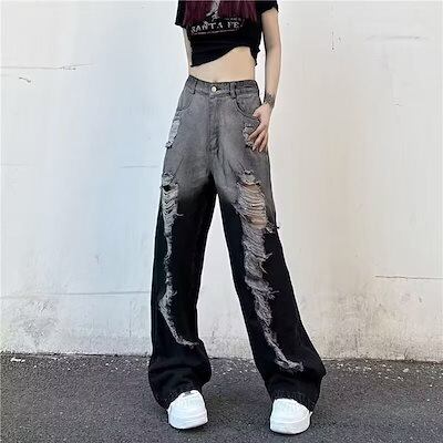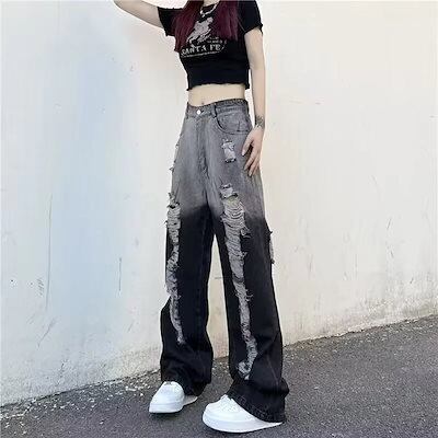 24人気新作ダメージジーンズレディース ハイウエストワイドパンツ韓国ファッション服流行りカジュアルデニムKW282