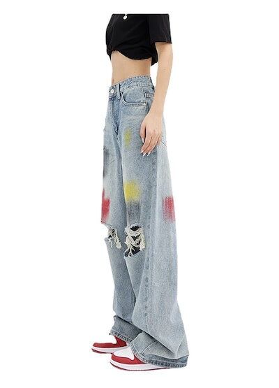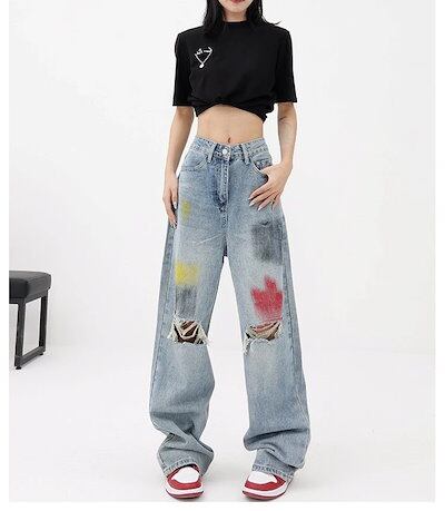 デニムパンツ 美脚 レディース ボトムス モップストレートパンツ ワイドパンツ 破穴ジーンズ 落書き青水洗 ジーンズ デニムボトムス