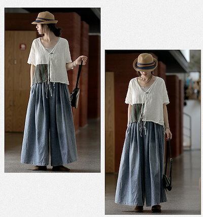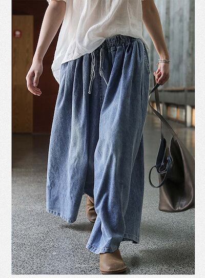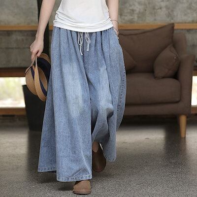 デニムワイドパンツ レディース 大きいサイズ ワイドパンツ ウエストゴム デニムパンツ ウチョパンツ フレアパンツ ボトムス カジュアル 無地 ロングパンツ 大人 楽ちん ゆったり カジュアル お腹