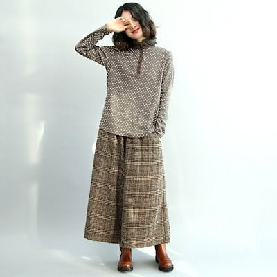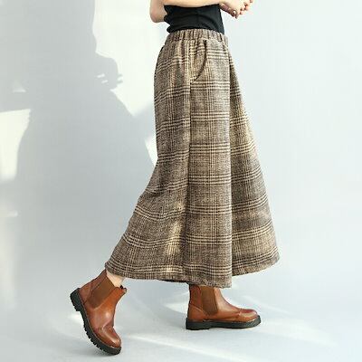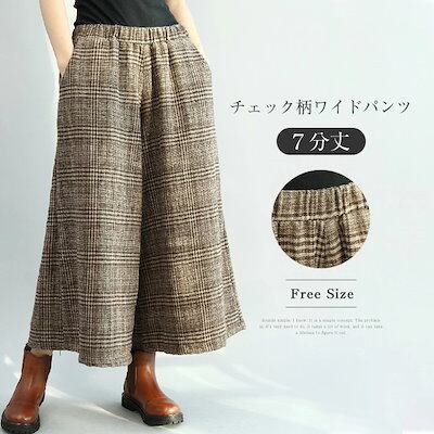 ワイドパンツ レディース ガウチョパンツ 7分丈 チェック柄 ウェストゴム 春ボトムス ズボンゆったり 大きいサイズ 秋冬 厚手 ロング ハイウエスト 体型カバー カジュアルコーデ 大人 おしゃれ き