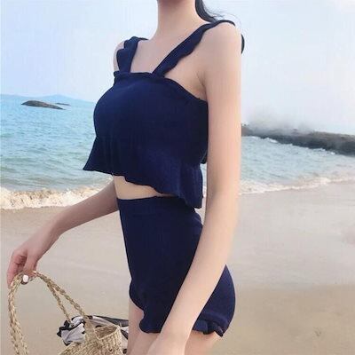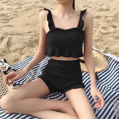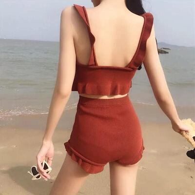 フリルハイウエストスイムウェア 韓国ファッション 新着 ニット水着 レディース セクシー シック スチューデント ソリッドカラー 保守的 スキニー タンキニ 水着