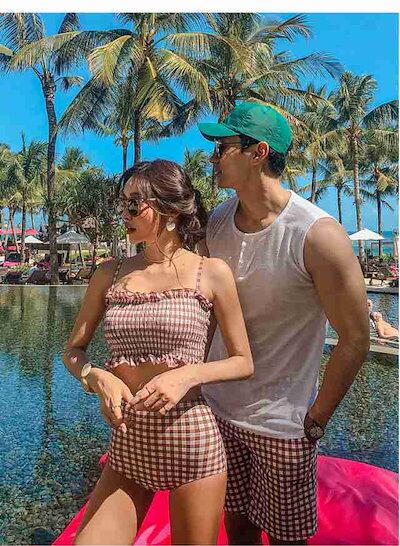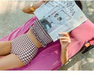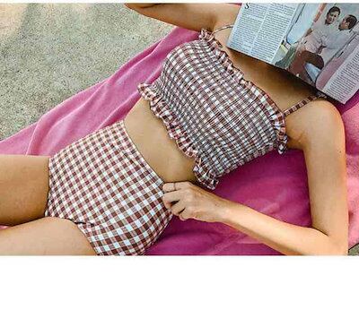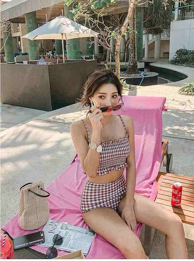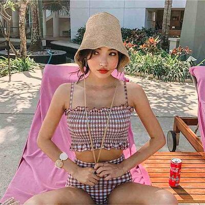 ビキニ 水着 レディース チェック柄 上下セット レトロ かわいい ベアトップ ハイウエスト キャミソール 格子柄 ギンガムチェック