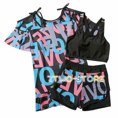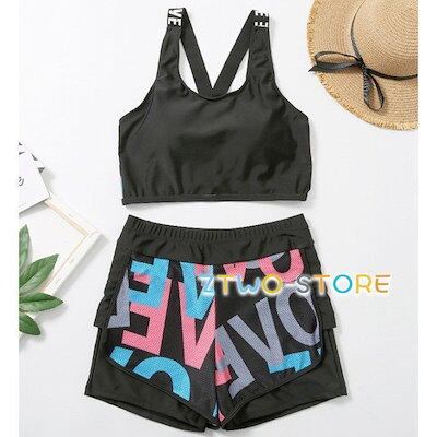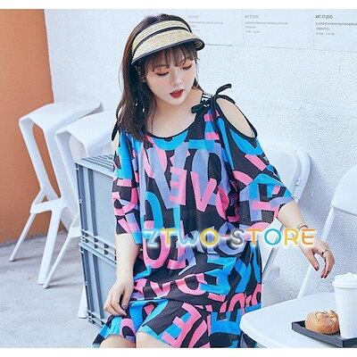 水着 レディース タンキニ水着 3点セット 大きいサイズ 3L 4L 5L 6L 体型カバー 韓国 カバーアップ Tシャツ ワンピース 露出少なめ 可愛い 個性的