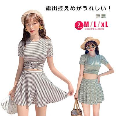 レディース 水着 ビキニ セパレート 2点セット 半袖 トップス スカート 体型カバー水着 ボーダー柄 リボン フレアスカート ウエスト お尻 太もも カバーアップ 代 30代 ママ水着