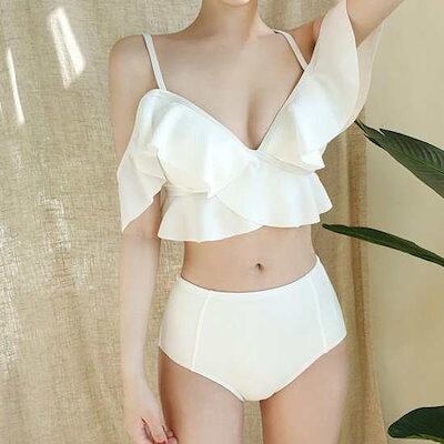 ビキニ レディース 水着 体型カバー 水着 オフショルダー エロい フリル 韓国 着痩せ クロスデザイン ハイウエスト 白 ホワイト ピンク スイムウェア ビーチウエア かわいい