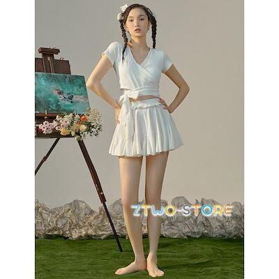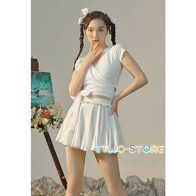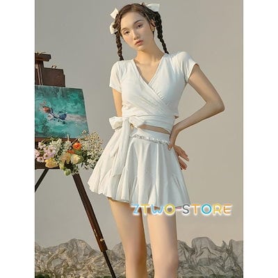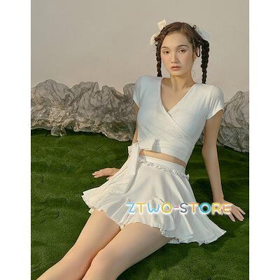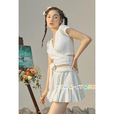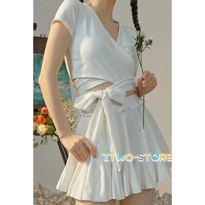 水着レディース タンキニ水着 体型カバー ビスチェ 水着 半袖 袖あり セパレート カシュクール リボン 大きいサイズ 韓国 フレアスカート フリル