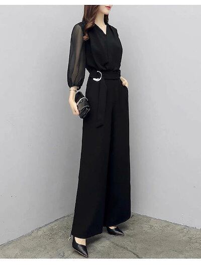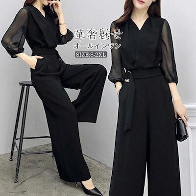 オールインワン レディース 春 秋 ワイドパンツ オールインワン シアー袖 大きいサイズ シンプル オフィス カジュアル レディース ファッション エレガント 着やせ OL 通勤 結婚式 二次会 入学