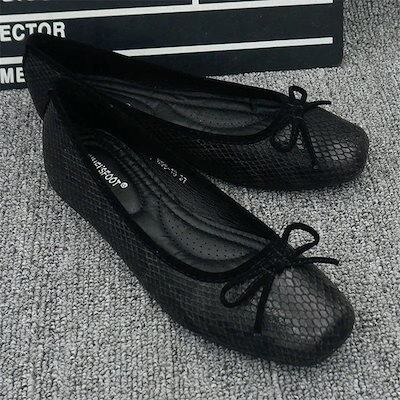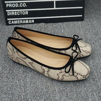 【メガ割 】3色 レディース パンプス ヘビ柄  チャンキーヒール ぺたんこ スリッポンシューズ リボン付き P