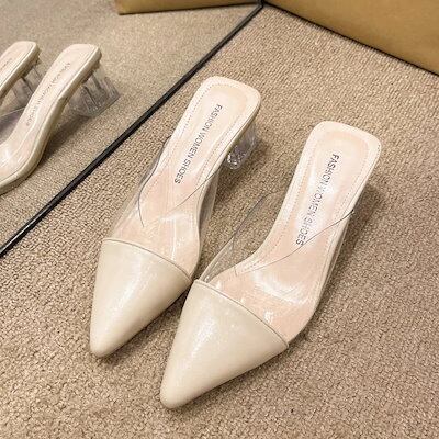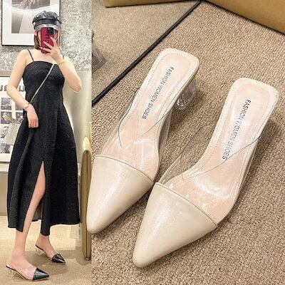 メガ割-スタイルアップヒールパンプス 韓国ファッション サンダル 気質厚いハイヒール女性25の透明なファッション尖ったサンダル包頭スリッパ