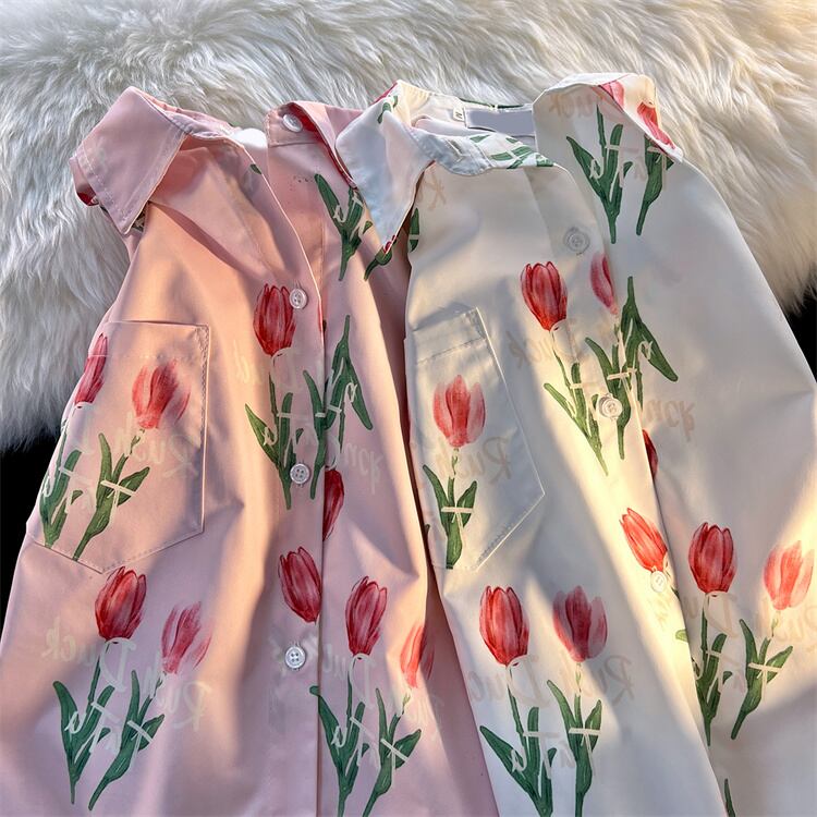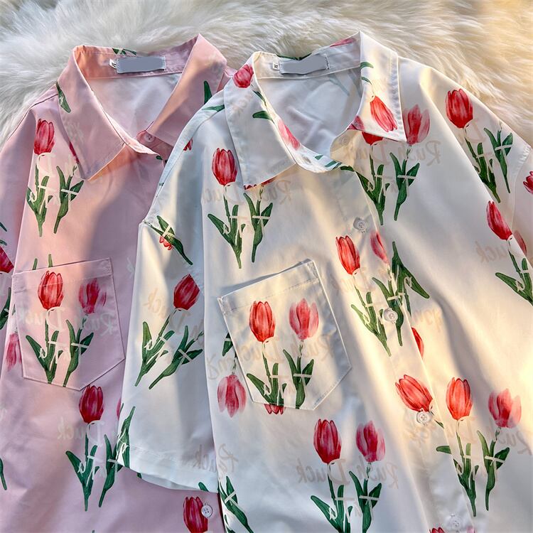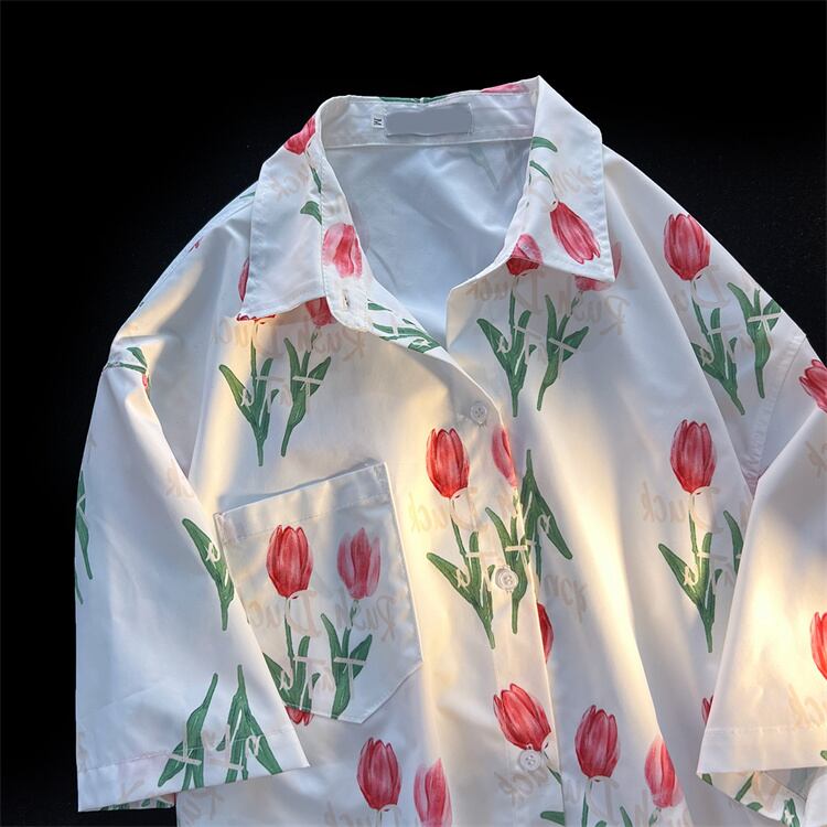 夏 カップル トップス 気質 お出かけ チューリップ 半袖 フラワーシャツ