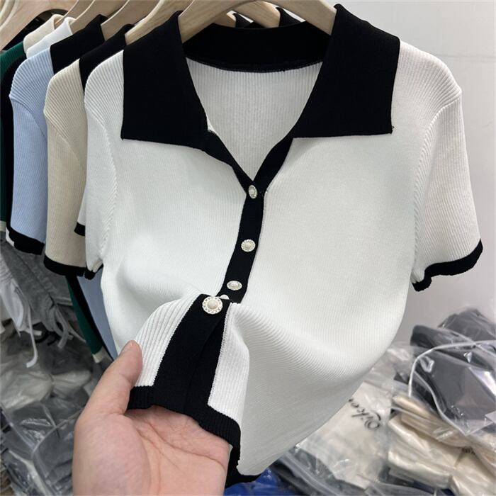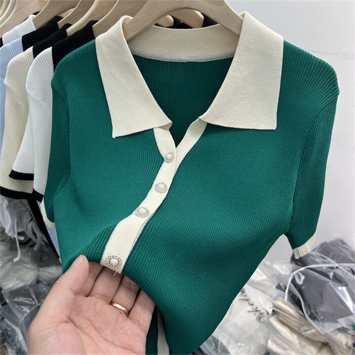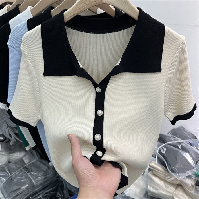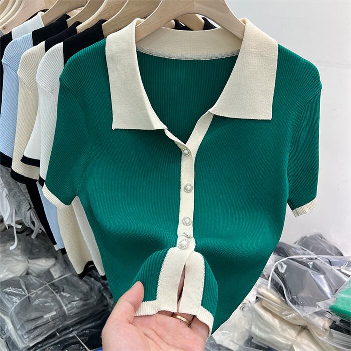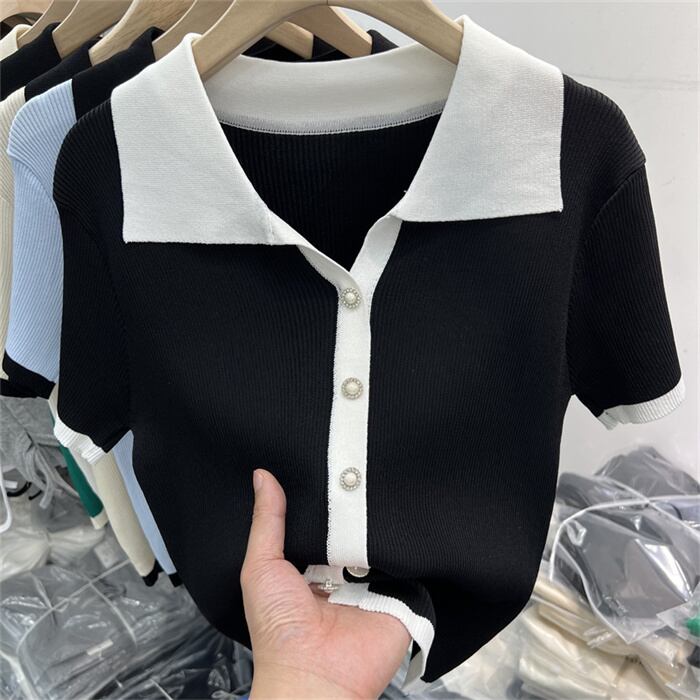 韓国大人気 コントラストカラー/ラペル/スウィート/編み物/スリムフィット/半袖/Tシャツ/トップス
