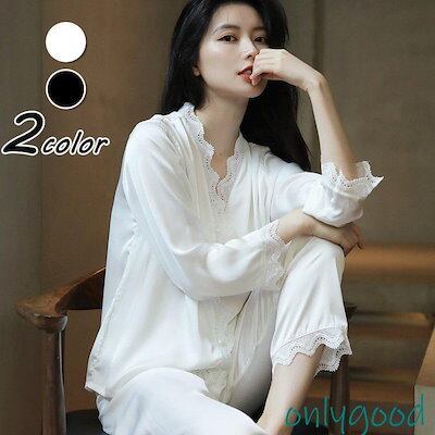 部屋着 女性 大人可愛いパジャマ ロングパンツ上下セット レション レースVネック 前開きルームウェア パジャマ 長袖 春夏秋 レディース ルームウェア パジャマ