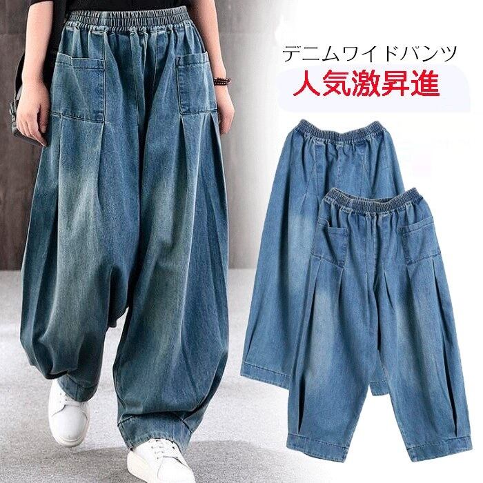 デニムパンツボトムフルレングスパンツハイウエスト春夏 薄手 デニム ワイドパンツ