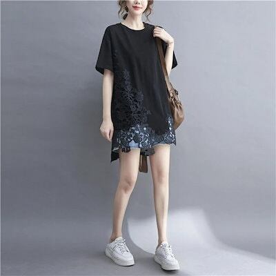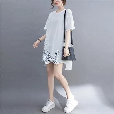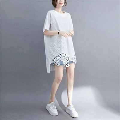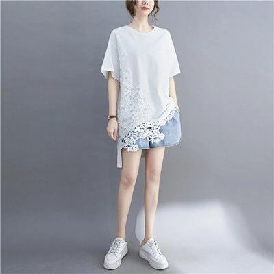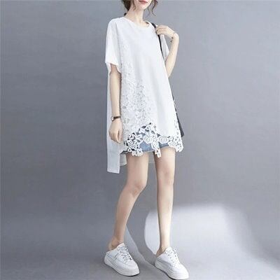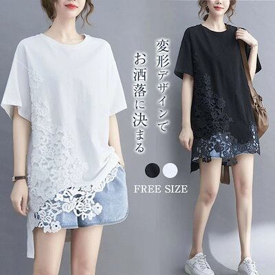 tシャツ レディース おしゃれ アシンメトリー tシャツ ロング 異素材 カットソー 半袖 レース 夏 チュニック 切り替え ロングtシャツ レイヤード シンプル トップス プルオーバー 無地 tシャ