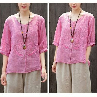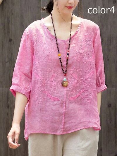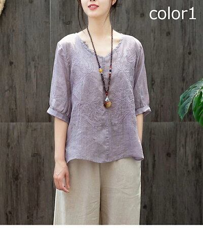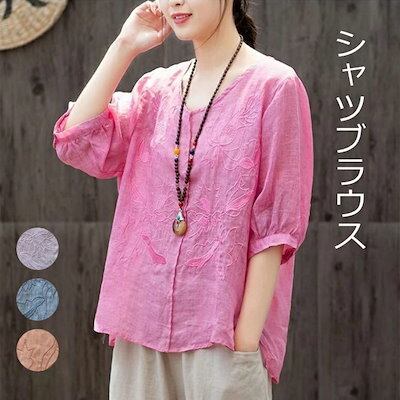 ブラウス レディース プルオーバー 半袖 夏 トップス チュニック Vネック コットン レース 刺繍 体型カバー ゆったり 綿混 大きいサイズ 前後差 花柄 透け感 着痩せ