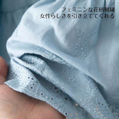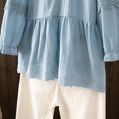 フリル ブラウス レディース バルーン袖 シャツ 綿 ペプラム バンドカラー 刺繍 袖フリル レース 長袖 トップス ボリュームスリーブ 軽い プルオーバー シアー 七分袖 刺繍ブラウス 春夏 着痩せ