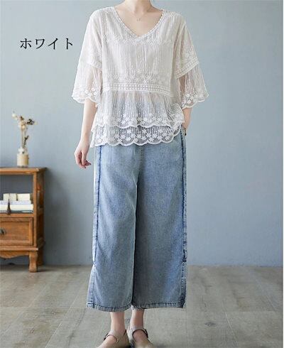レースブラウス レディース ブラウス レース ブラウス tシャツ カットソー 春夏 花柄 ブラウス 白 フリル Vネック フレア タブル透け感 刺繍 ブラウス シアートップス フレア袖 可愛い 大きい