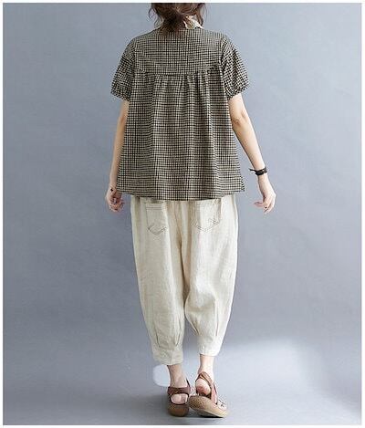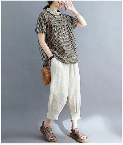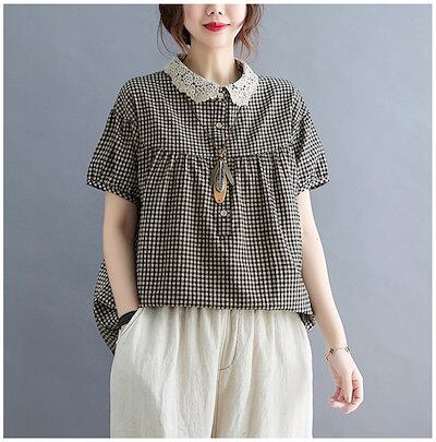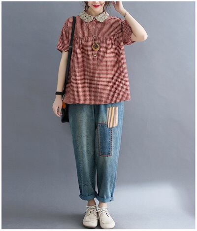 ブラウス レディース 半袖 夏 チュニック チェック柄 チュニック 体型カバー シャツ 綿麻混 大きいサイズ ゆったり uvカット トップス チビ襟 レース襟 切替 シンプル 50代 30代 40代