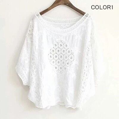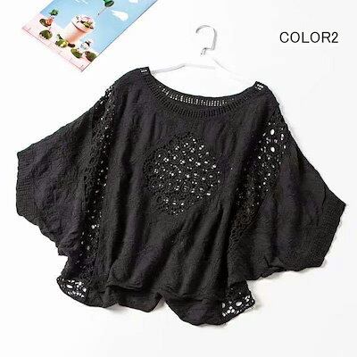 レース ブラウス レディース トップス 半袖 レーストップス 夏 プルオーバー Tシャツ 花柄 透かし彫り シースルー 透け感 綿 コットン 無地 ホワイト ブラック 体型カバー 刺繍 ゆっ