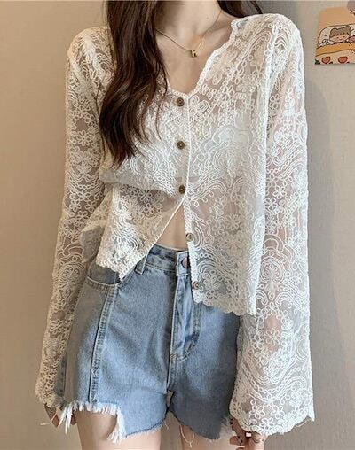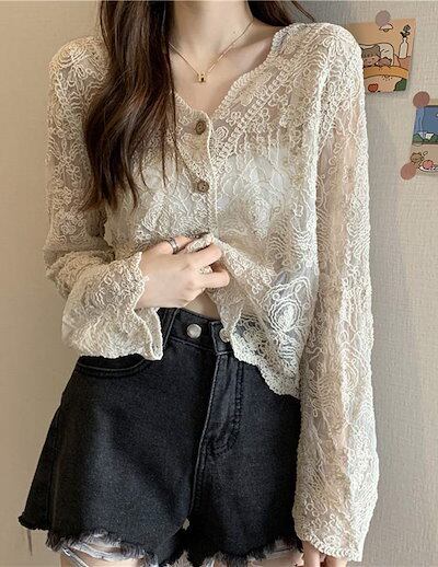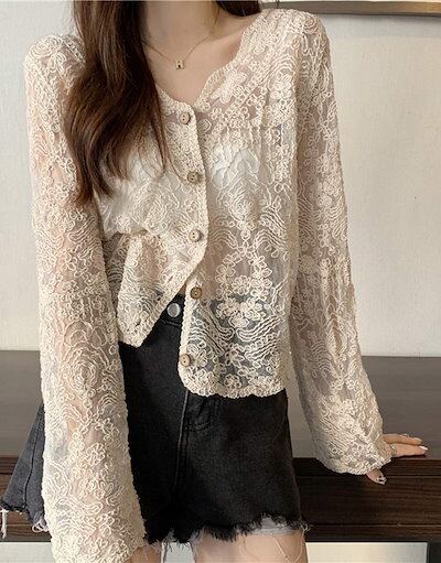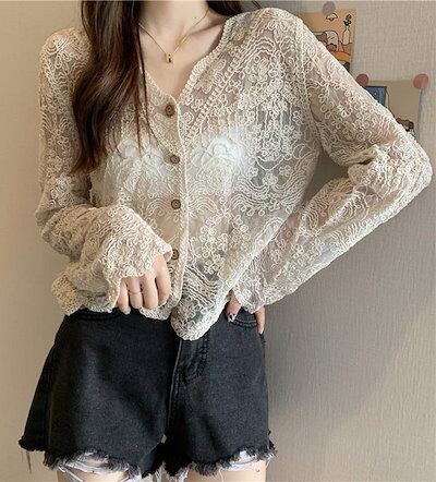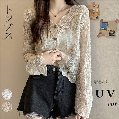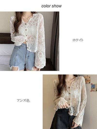 カーディガン レーストップス 総レース レディース UVカット 長袖 ショート丈 透け感 日焼け止め 透かし編み Vネック レース トップス 薄手 羽織 切り替え ウェーブ袖口デザイン きれいめ コー