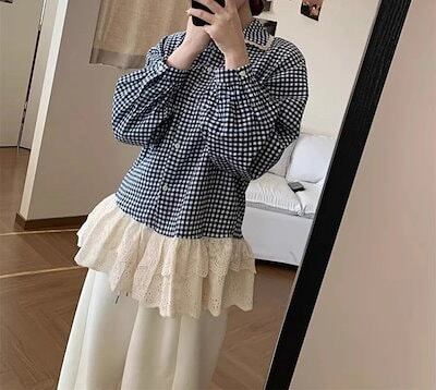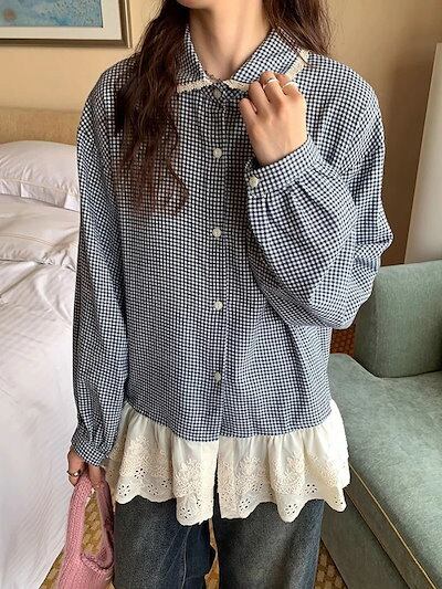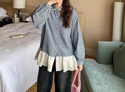 ブラウス レディース 長袖 チェック柄 シャツ 裾レース 切替 ブロックチェック プルオーバー トップス ギンガムチェック ゆったり カジュアル ナチュラル キレイめ 大人可愛い 着?せ 森ガール ブ